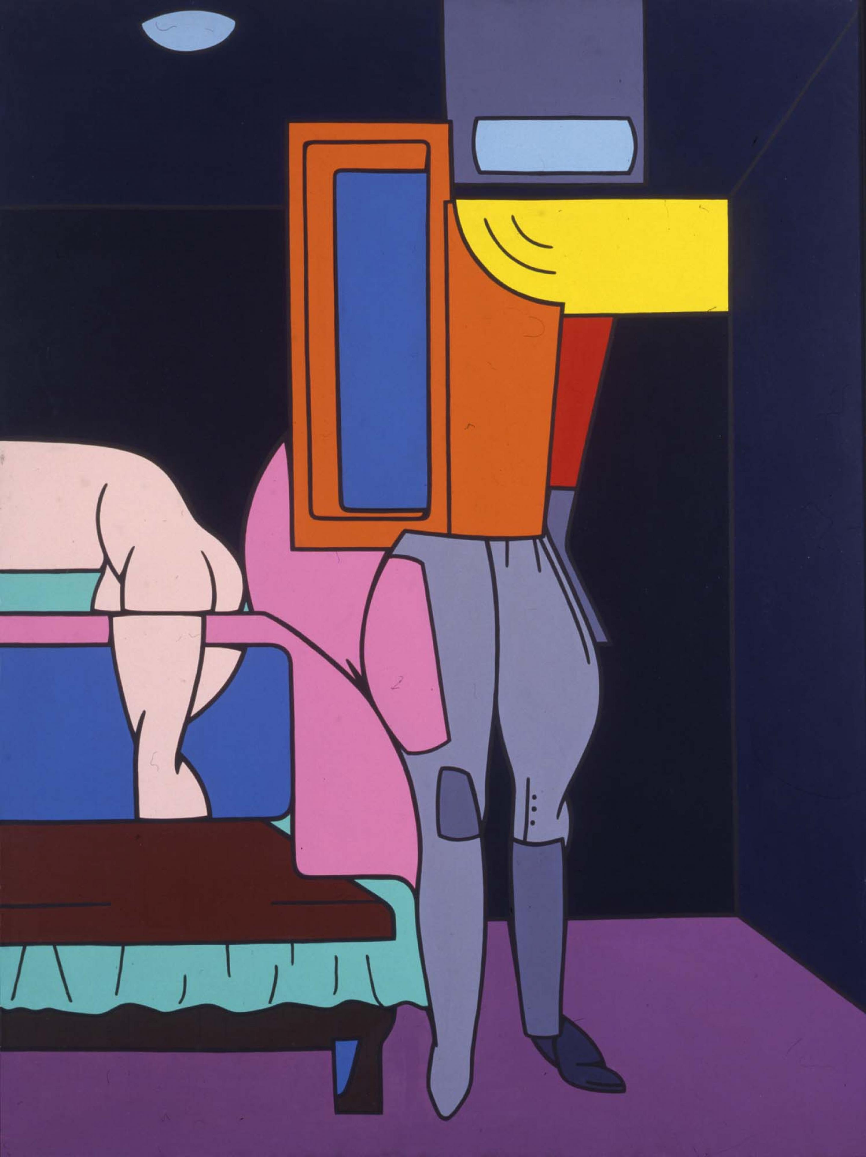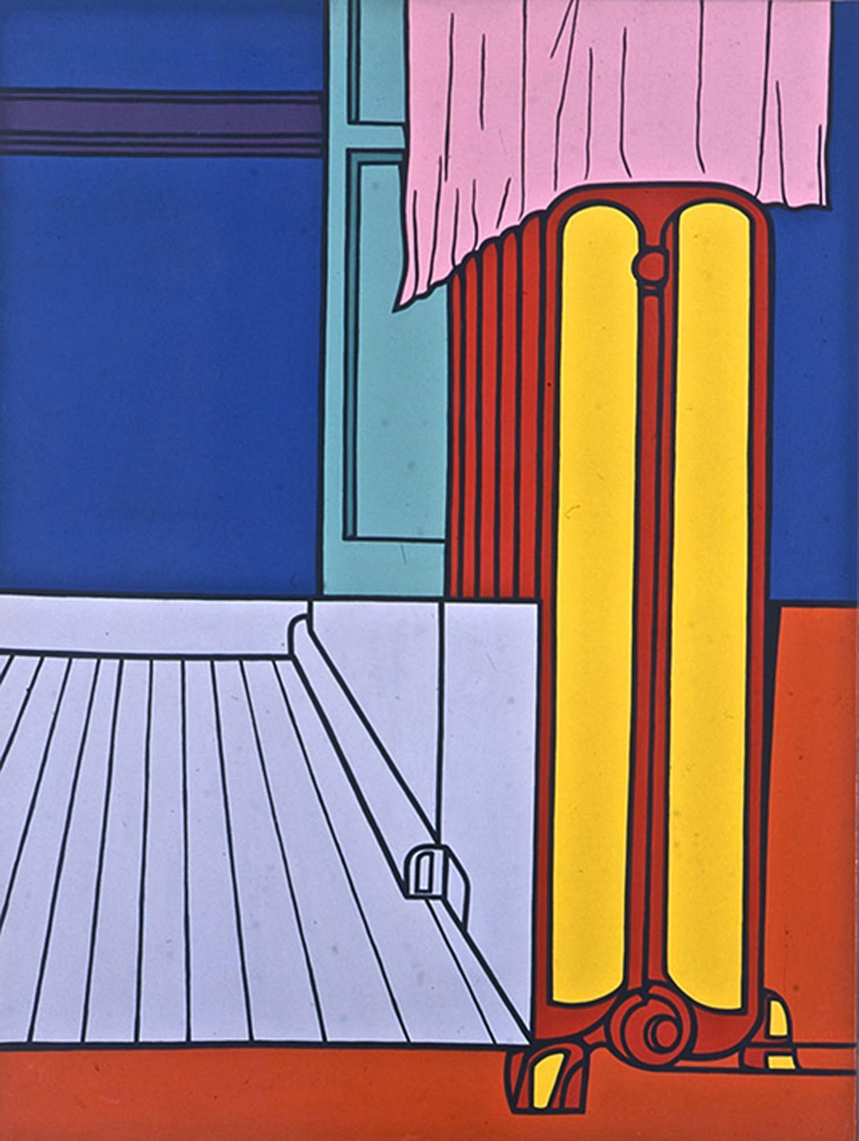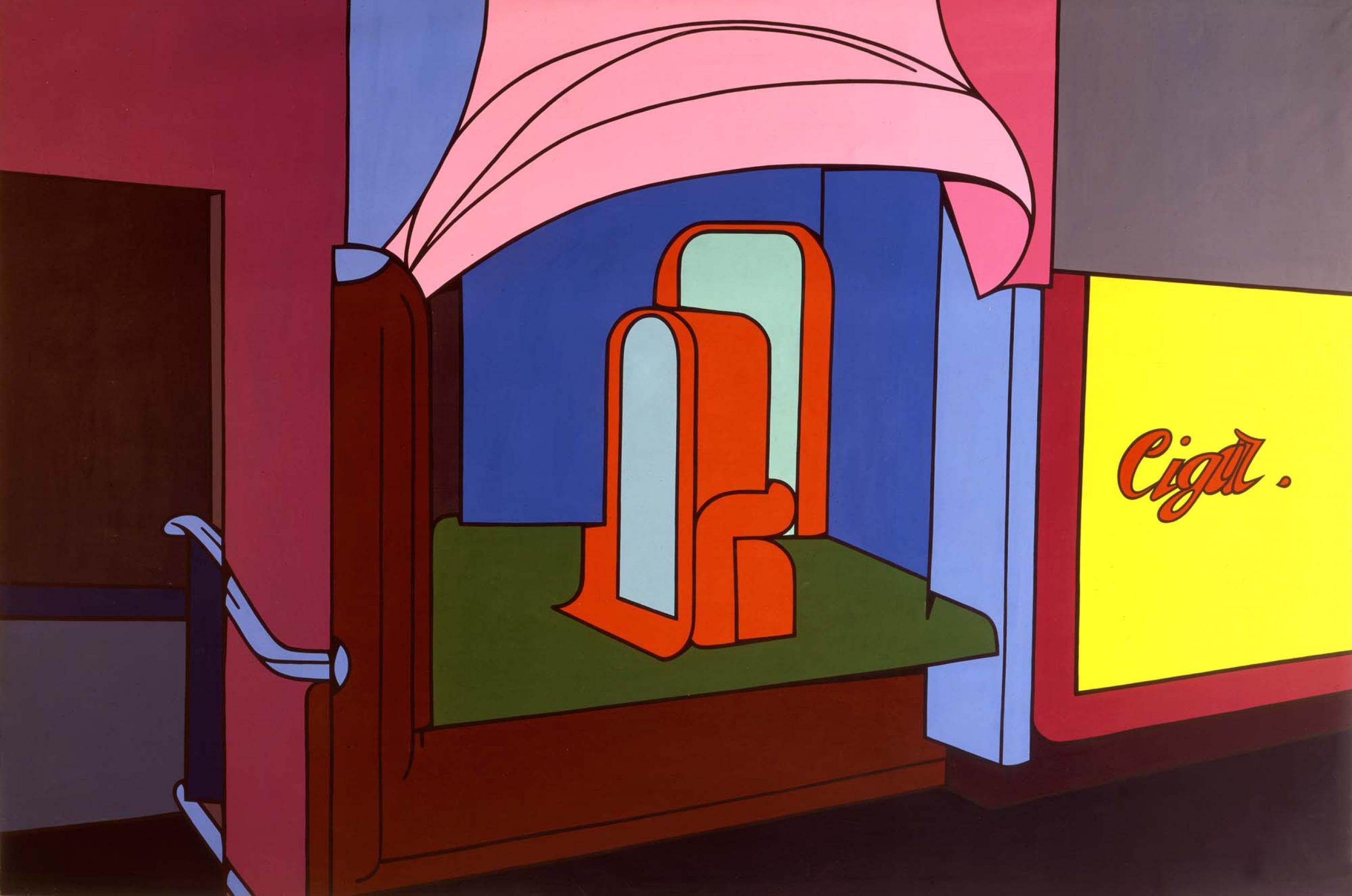 In the later 1960s there was a shift away from the uber-energetic earlier depictions towards more static paintings and a slightly darker colour palette. Many of these later works featured seemingly lifeless, deserted, anonymous and impersonal urban spaces and lusciously sensuous, pastel-colored interiors.