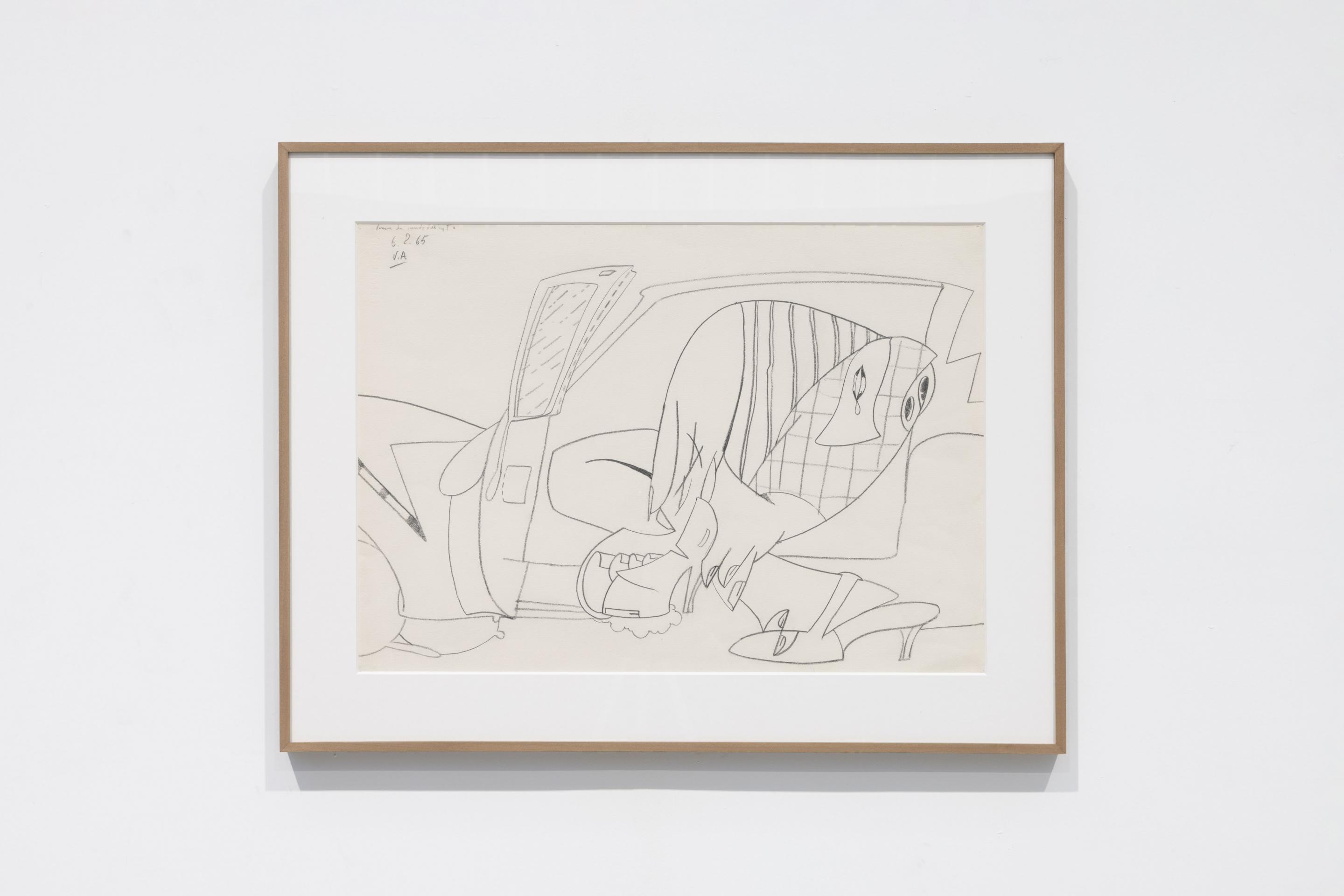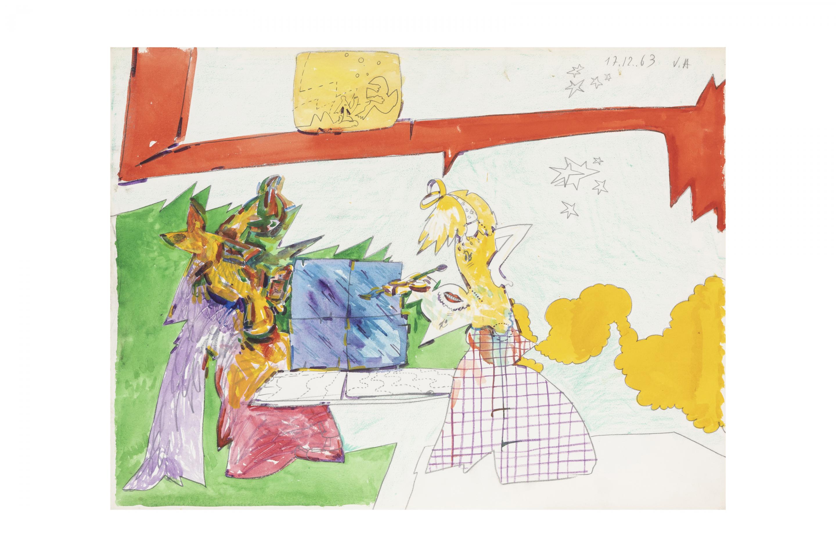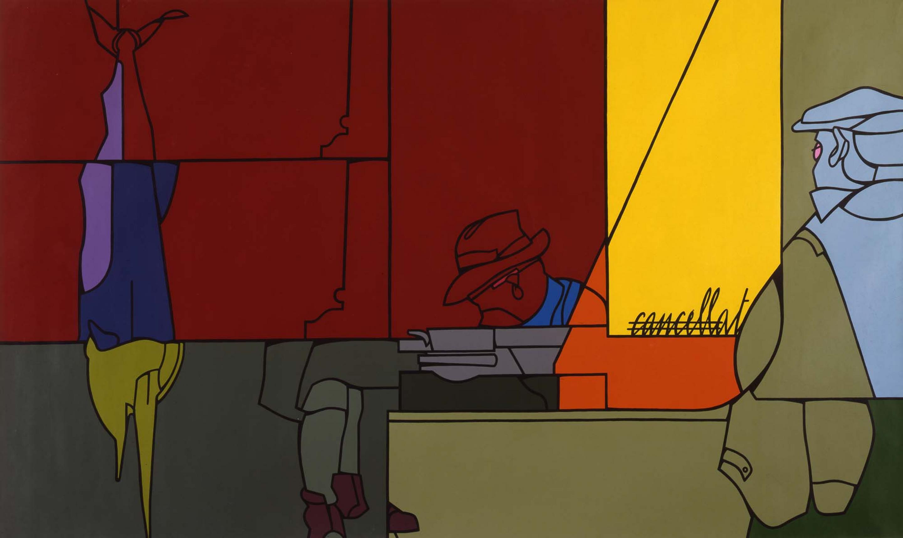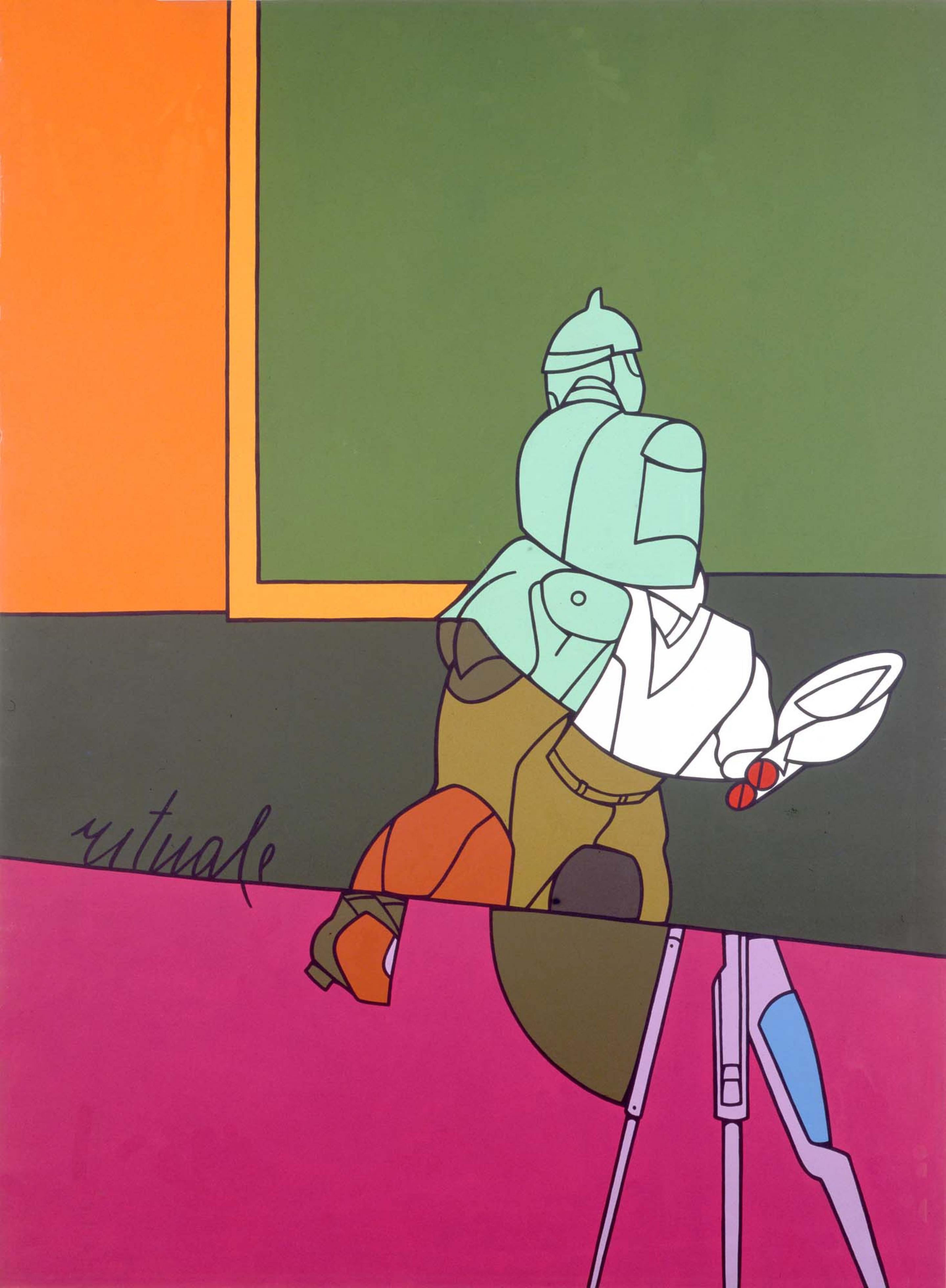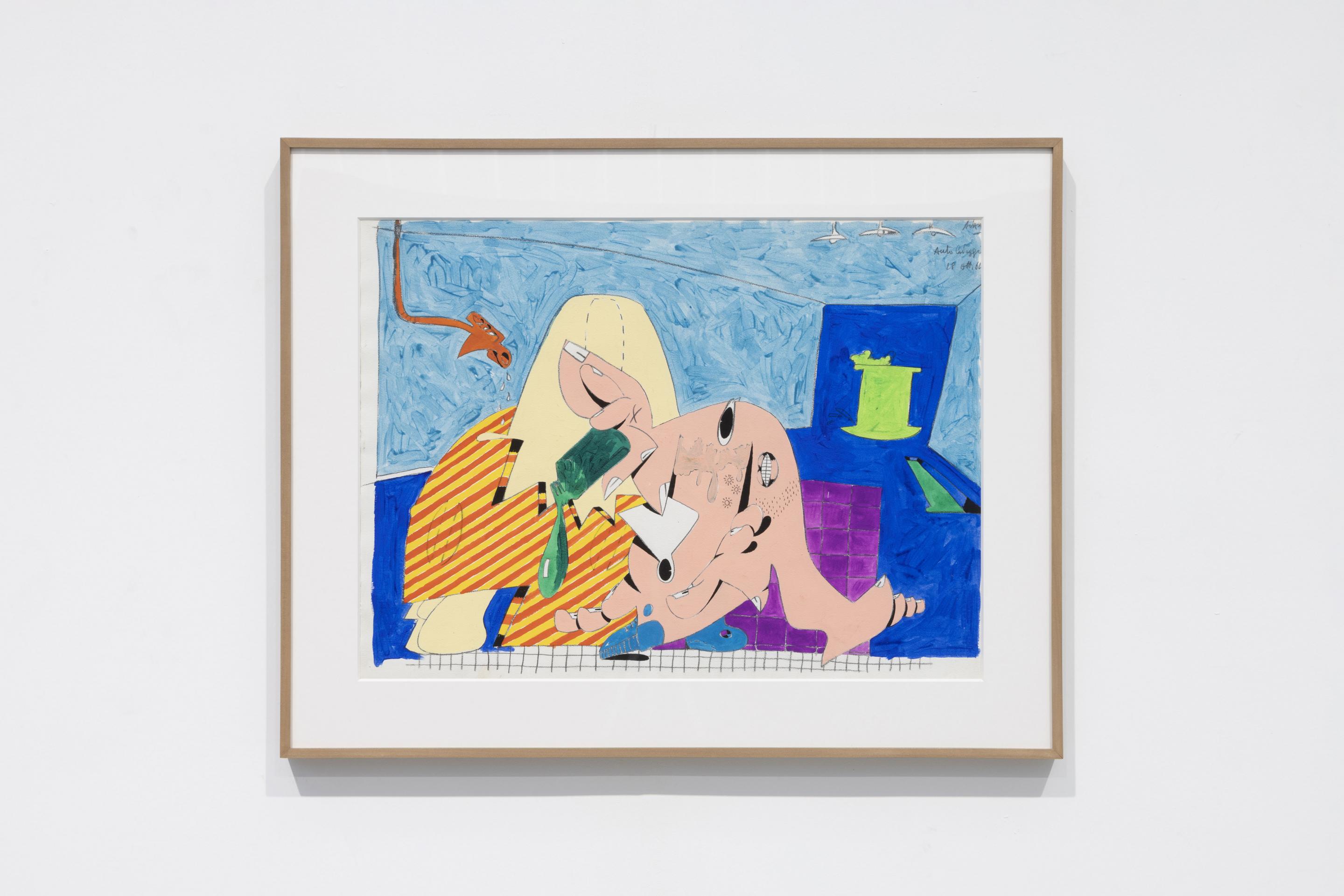 Looking at Adami’s work from the 1960s, comic books and cartoons as well as the graphic art of billboards come to mind. Further influences were Cloisonnism, a post-Impressionist movement in which bold, flat forms of color are bordered by black lines, and British Pop art with its inspiration from commercial advertisements, magazines, movies and celebrity culture. In his paintings from that decade, Adami used shapes of flat, saturated colour bordered by pronounced black lines. He similarly used elements from everyday life, inserted them into the structure of his figurative narratives and put them into new and different relationships with each other. The stimulus for his art was the real world as an alternative draft to an artistic ivory tower: “To clarify and give order to the way we represent the real world in which we live… To make use of everyday language, the kind used by people at the café, in the supermarket… To find the concrete origin of the most intimate impulses”. (Valerio Adami 1956-1963. The Years in Milan, Skira, Milan 2015, p. 166).