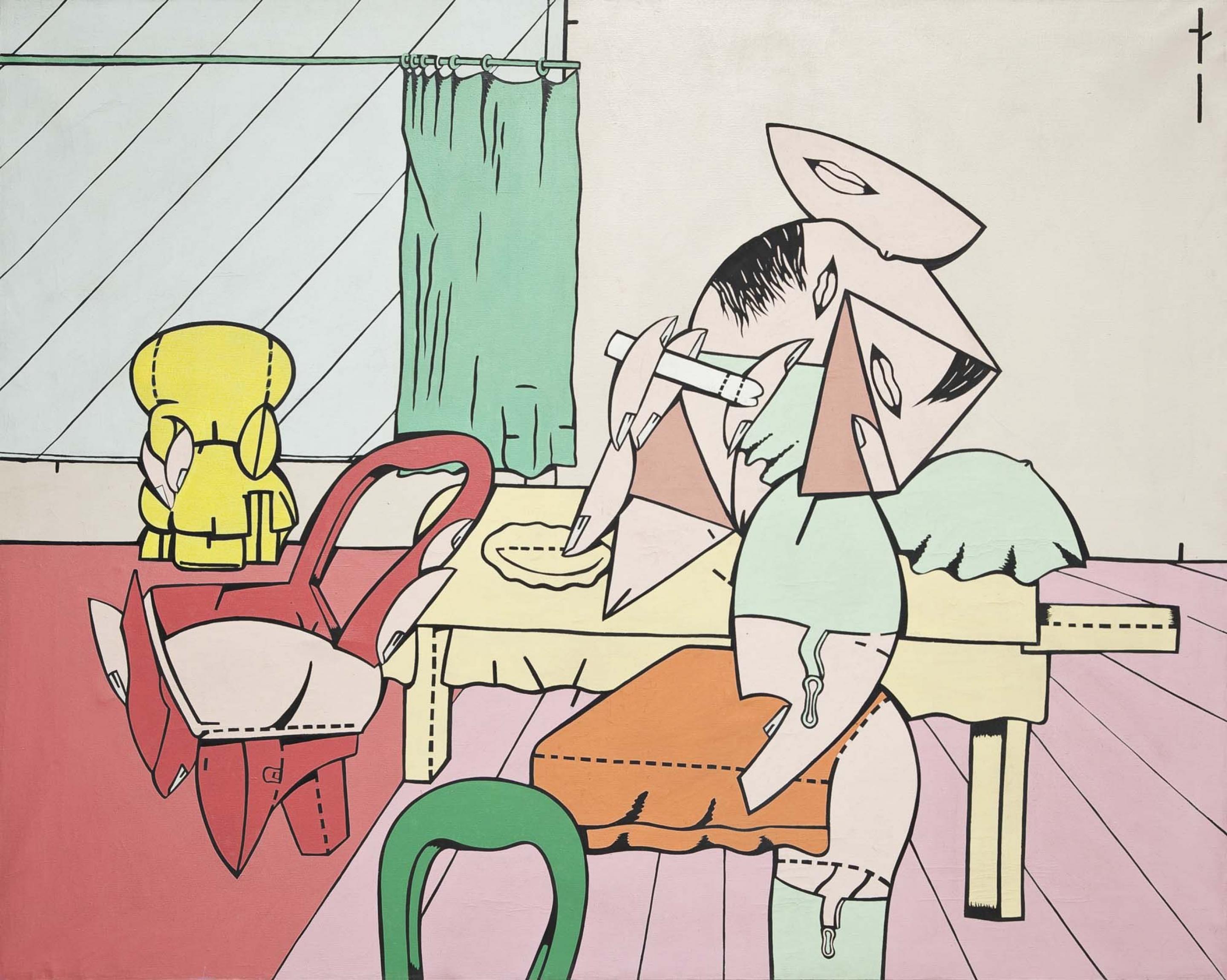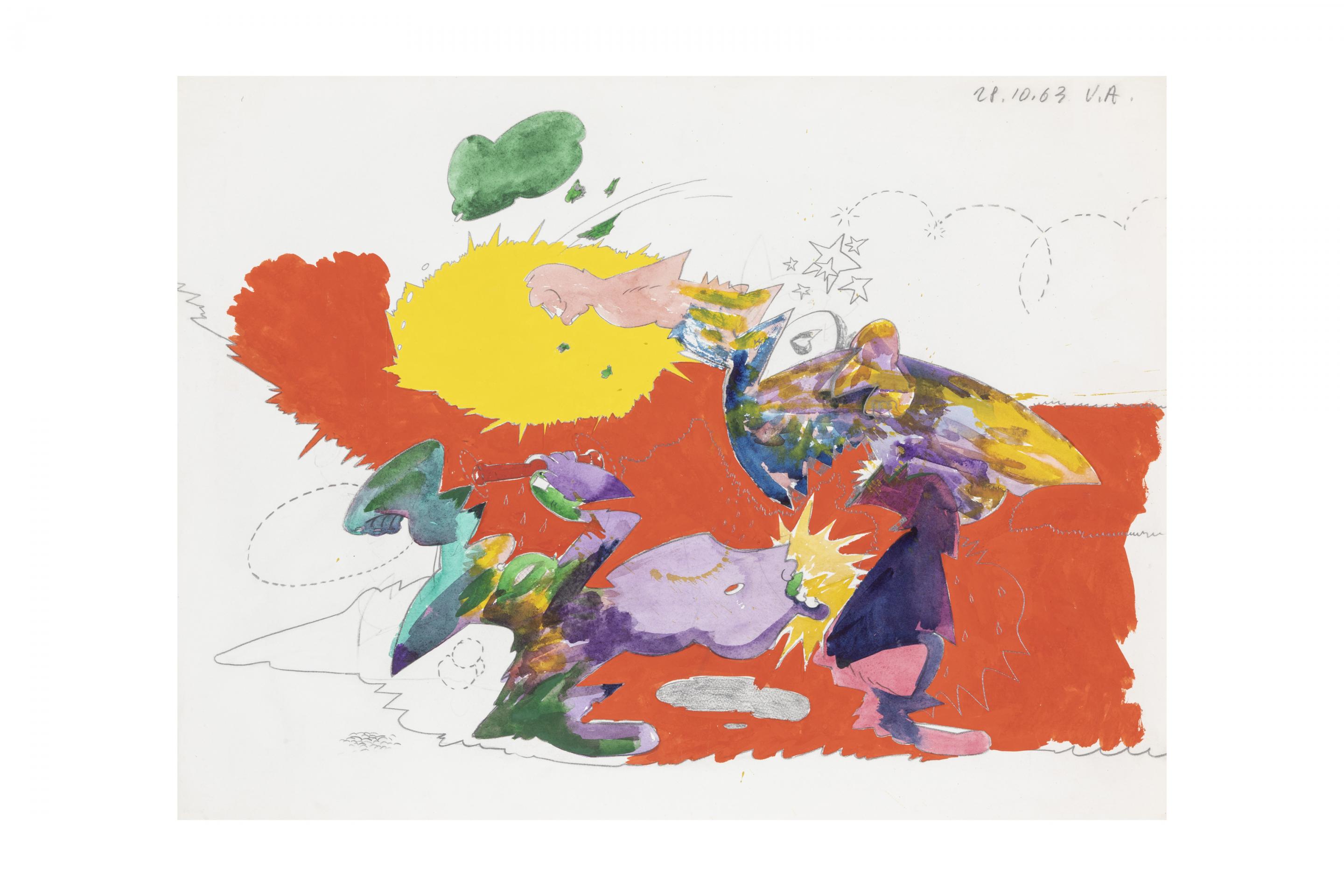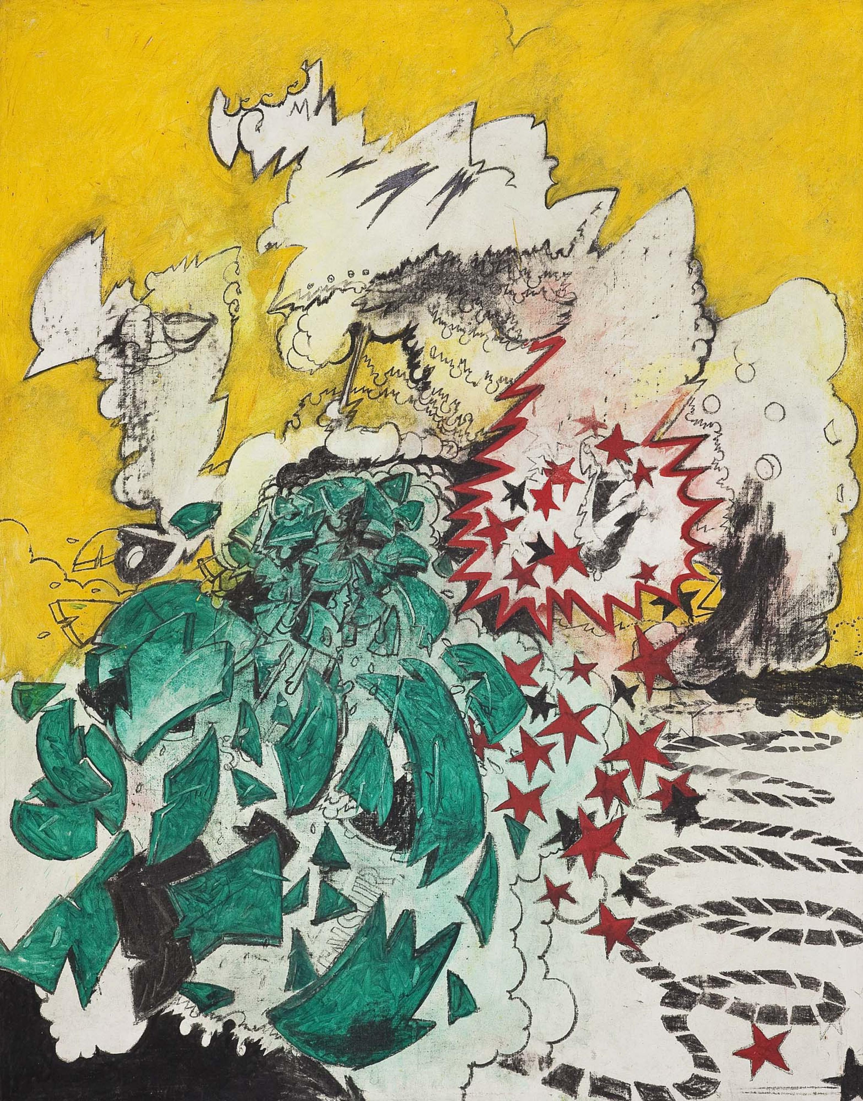 Many works from the early 1960s depicted pure energy and frenzy: objects blown into a thousand pieces, cosmic rays and dense smoke clouds mixed with speech bubbles, stars, onomatopoetic keywords and body fragments such as lips, fingernails or legs.