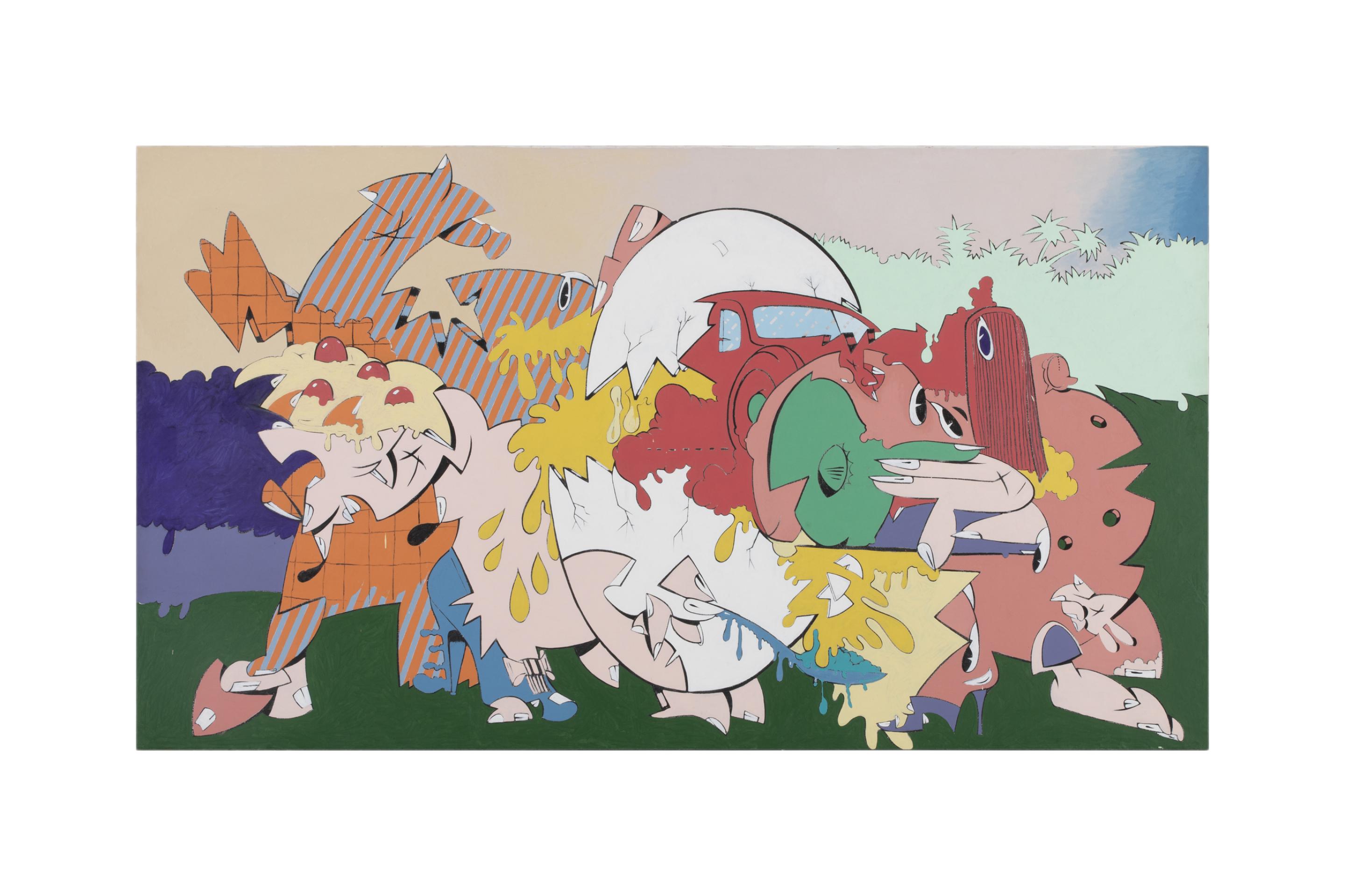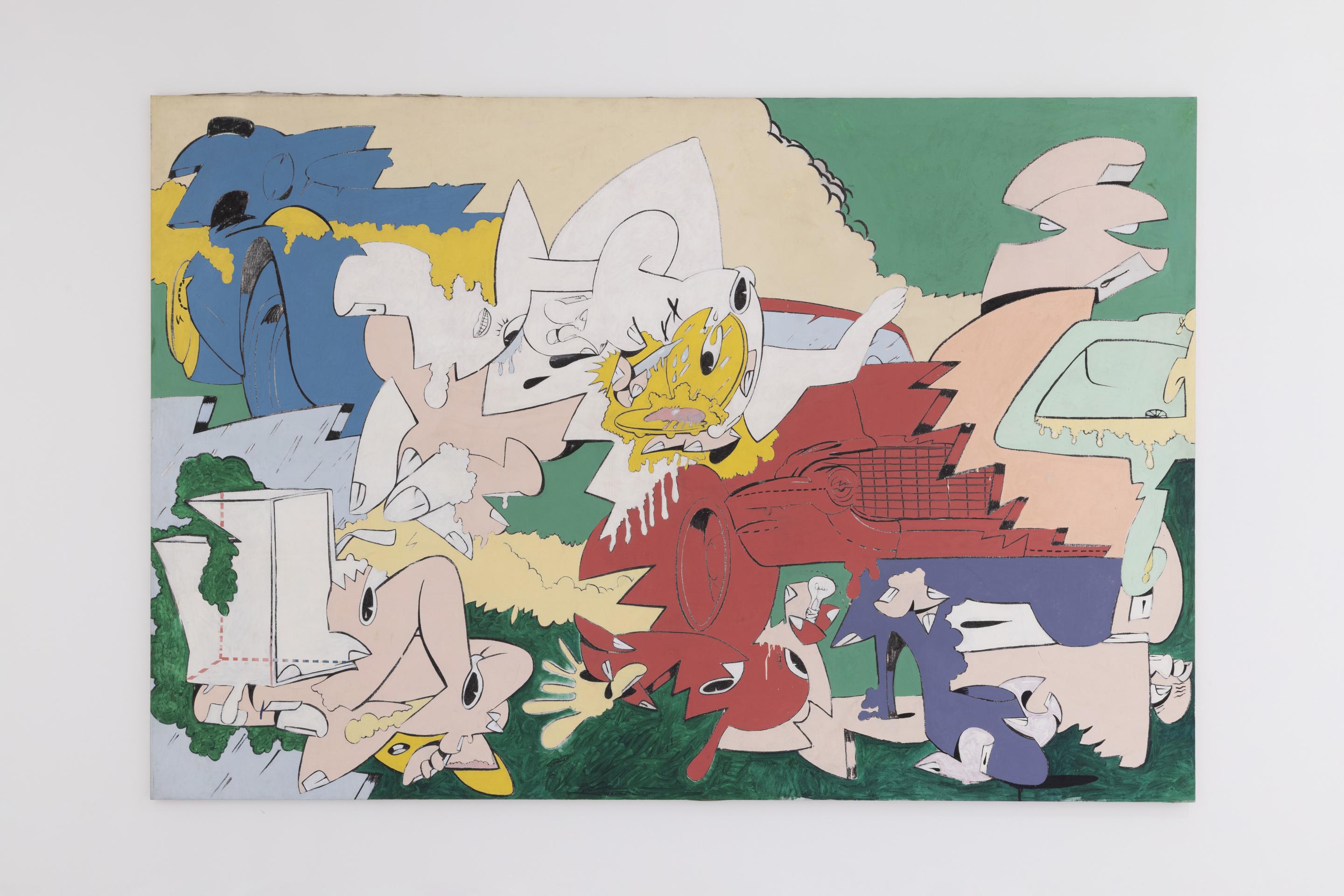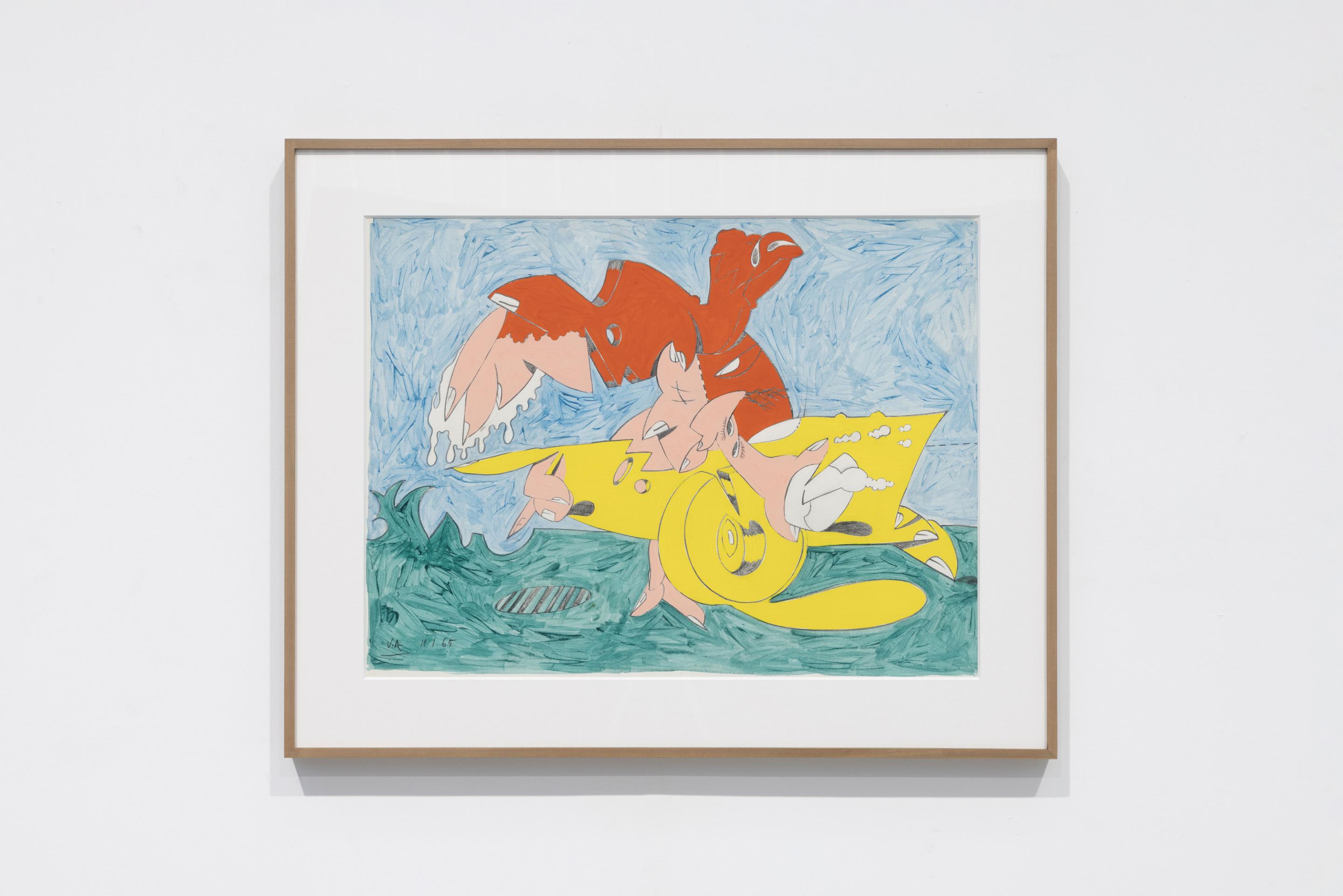 Many works from the early 1960s depicted pure energy and frenzy: objects blown into a thousand pieces, cosmic rays and dense smoke clouds mixed with speech bubbles, stars, onomatopoetic keywords and body fragments such as lips, fingernails or legs.