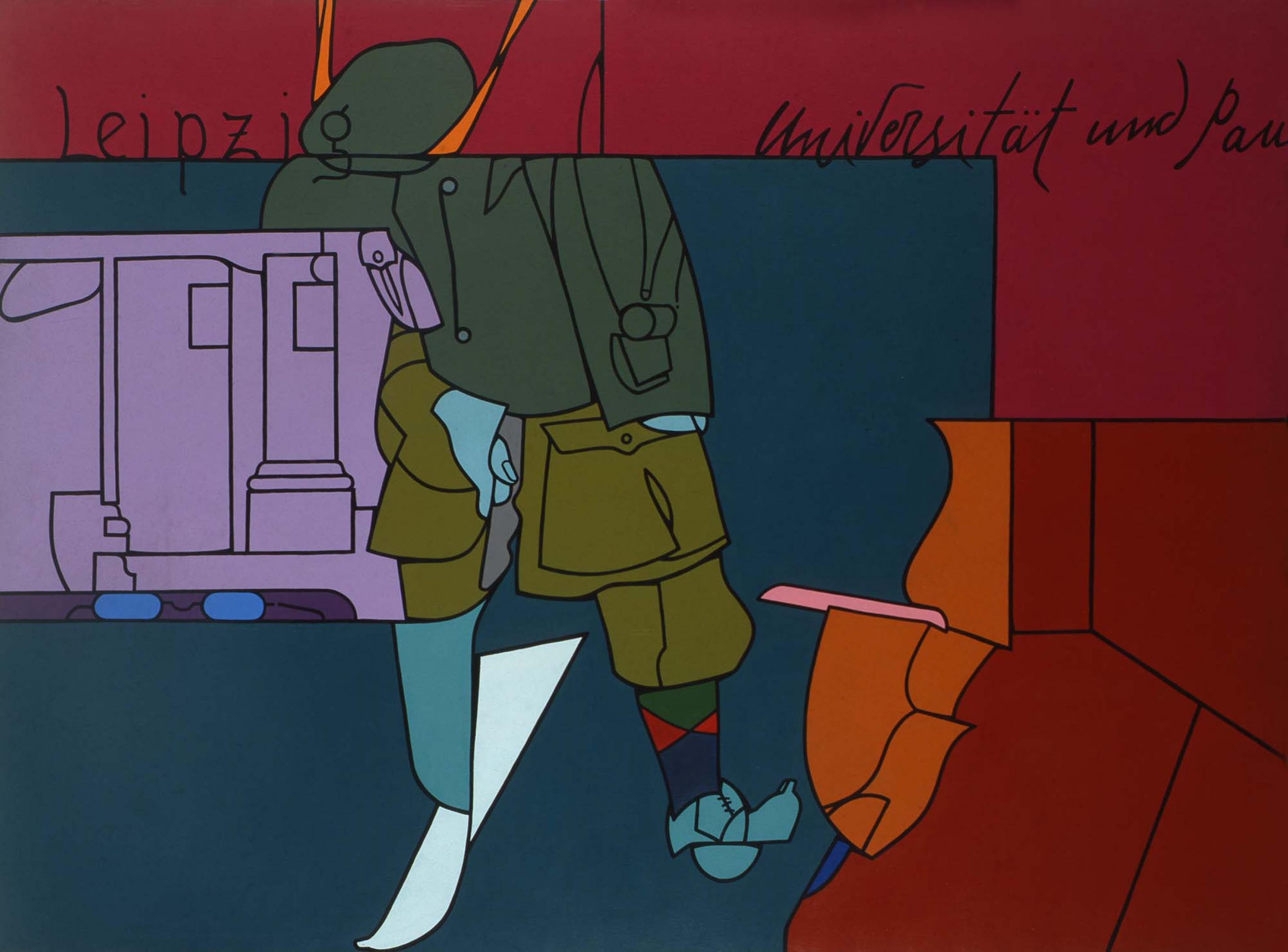 In the 1970s Adami’s style changed considerably. Following the urban spaces and interiors of the 1960s were referential yet enigmatic paintings that juxtaposed letters and phrases with the depicted image. The human figure as a whole much rather than just body fragments became the focal point of his works. The formerly bright colour palette became much more subdued as more earthy and natural tones took hold of his paintings. The pronounced black lines became more subtle and Adami’s overall interest shifted towards literature, history, philosophy, music and mythology.