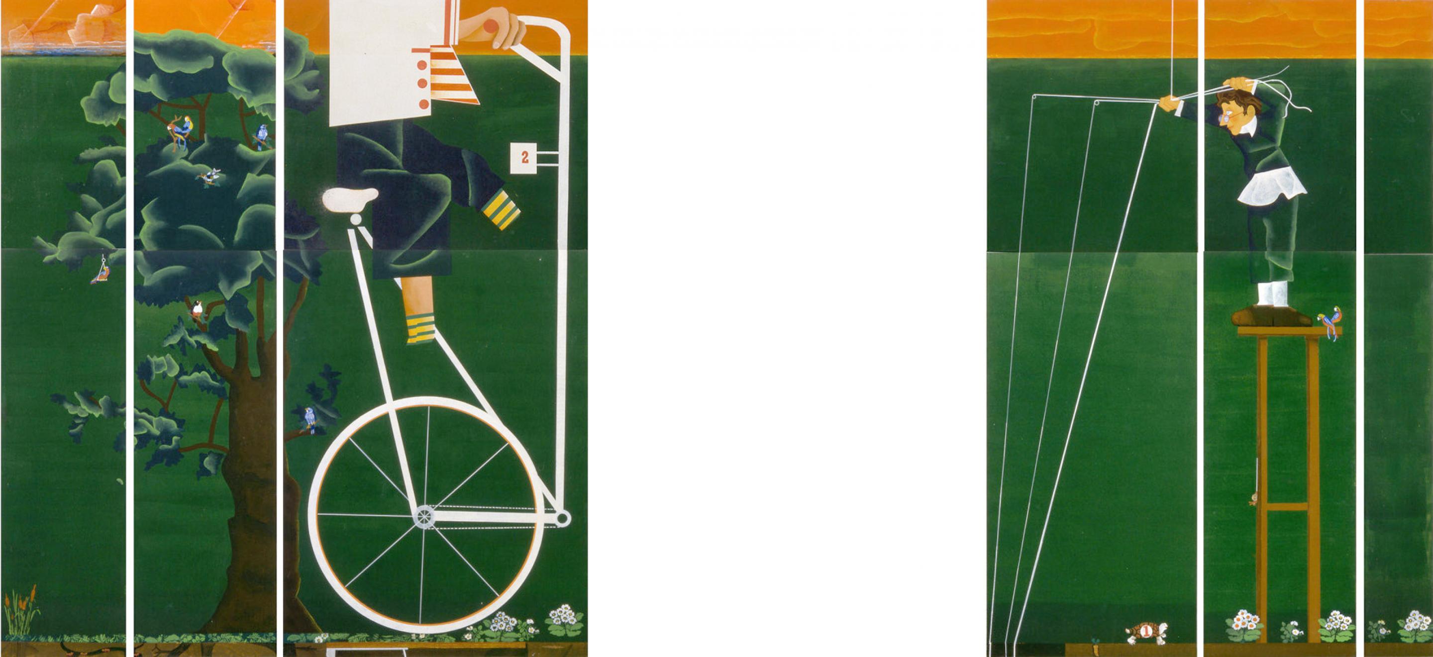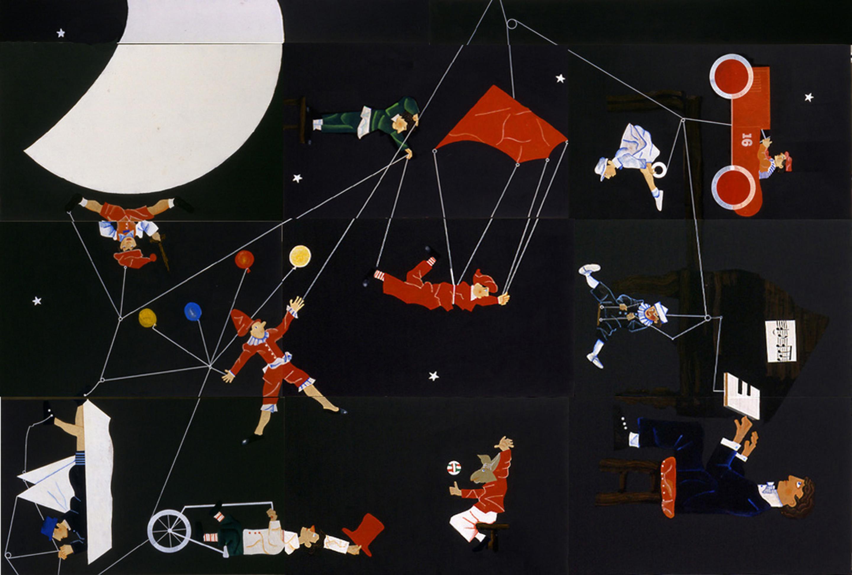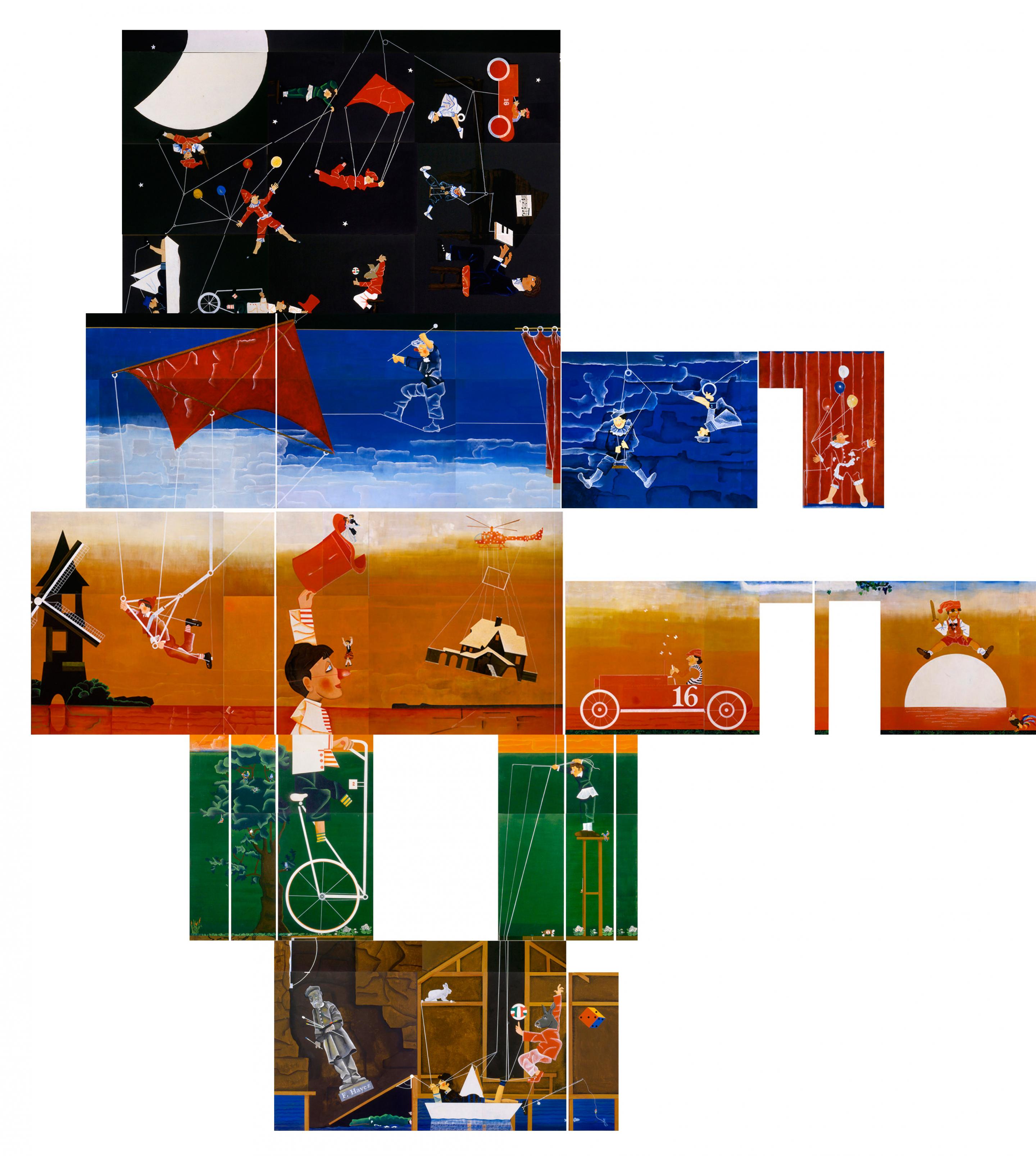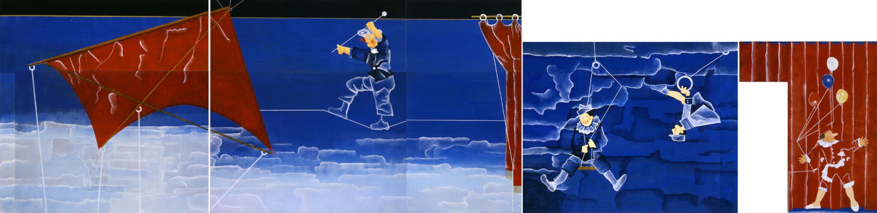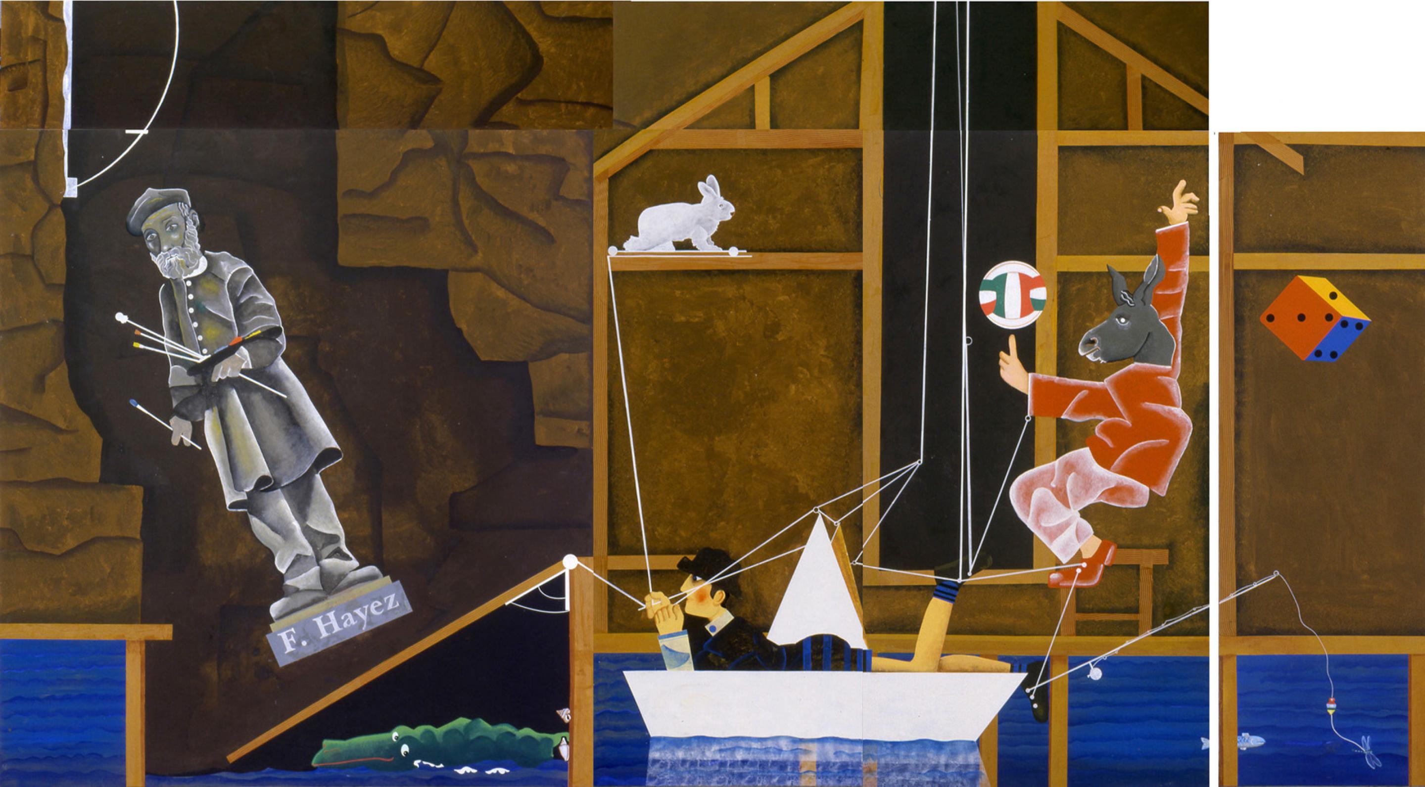 Per progettare questo quadro non ho guardato, come ero solito fare in passato, le ultime tendenze dell'arte contemporanea, ma ho voluto sfidare le più grandi imprese decorative di tutti i tempi (la camera degli sposi a Mantova, le stanze vaticane di Raffaello, i mosaici Ravennati, l'Angelico a San Marco, Goya alla Quinta del Sordo). Si! Questa pittura è tutto l'opposto del "nudo che scende le scale" di Duchamp. Qui salire e scendere è la stessa cosa, fan parte dello stesso ciclo: il ciclo dell'eterno ritorno. Salendo e scendendo e attraversando il giorno (piano terra, primo piano) si ritorna dalle stelle notturne (nel soffitto) alle stelle (nella grotta del sottosuolo).