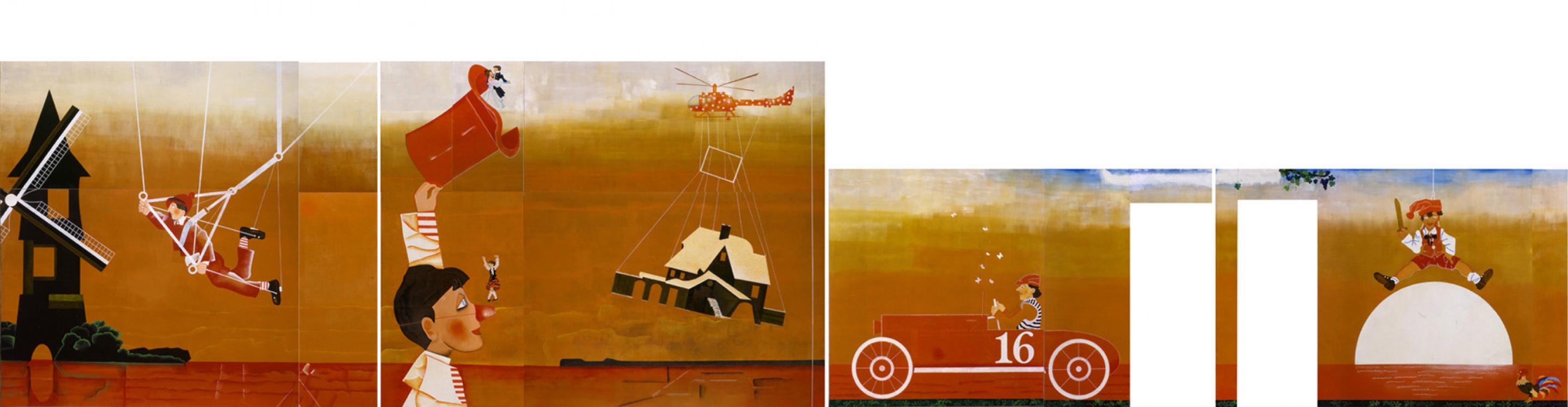 Dopo aver dipinto i 9 quadri collocati nella scala della nave Costa Concordia mi è apparsa all'improvviso l'idea di attraversare con un unico grande quadro di 16 metri di altezza soffitti e pavimenti dei quattro piani della Fondazione Marconi. Guadare con un unico dipinto all'acqua i bordi dei pavimenti e dei soffitti mi è sembrata un'avventura degna di essere rappresentata. E così ho fatto: ho dipinto tutta la tromba.