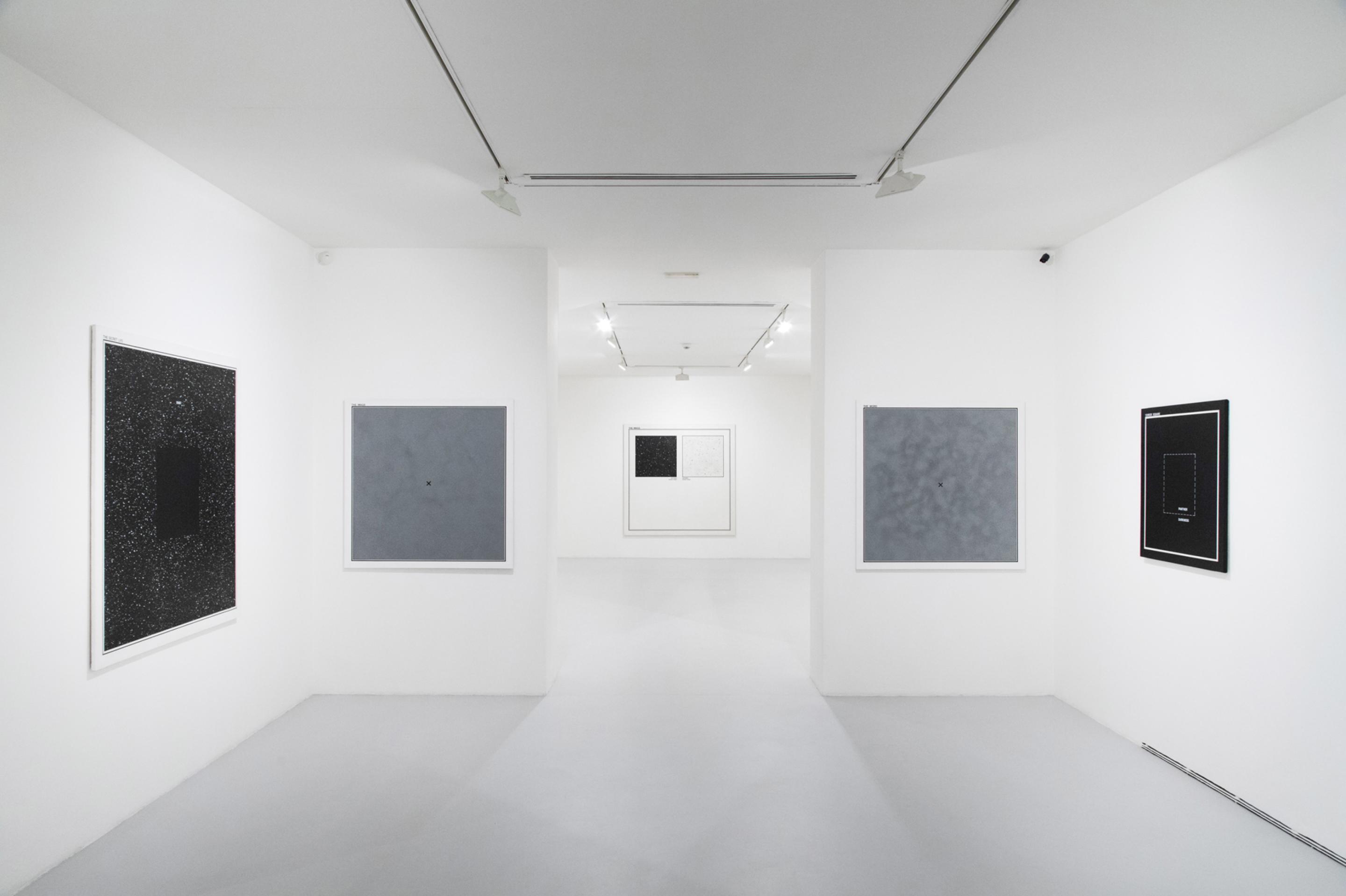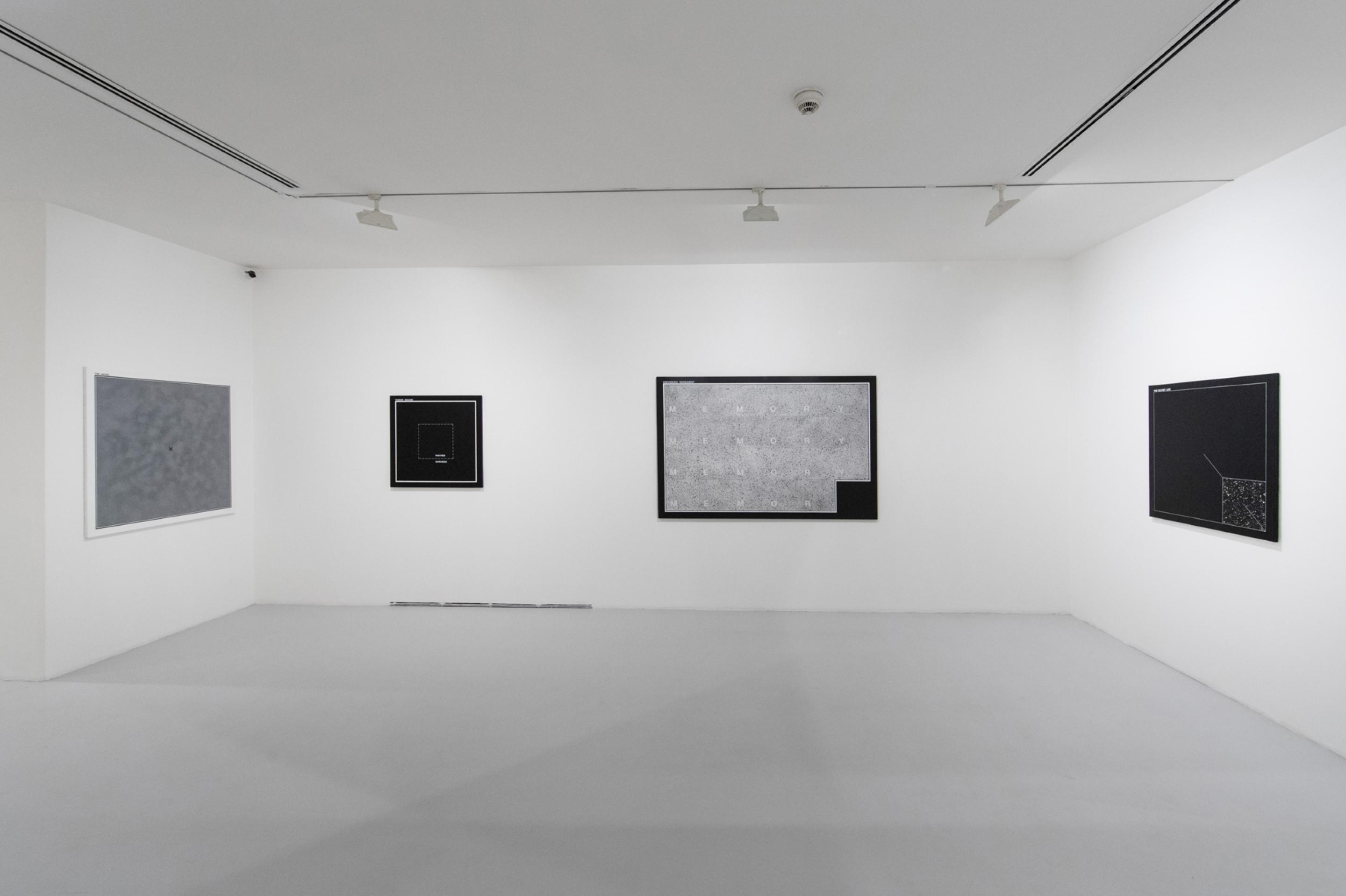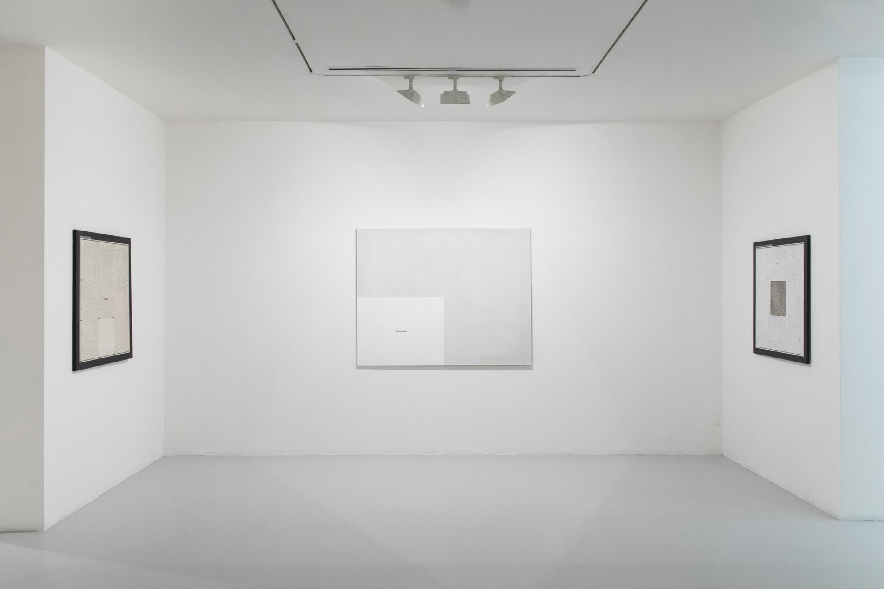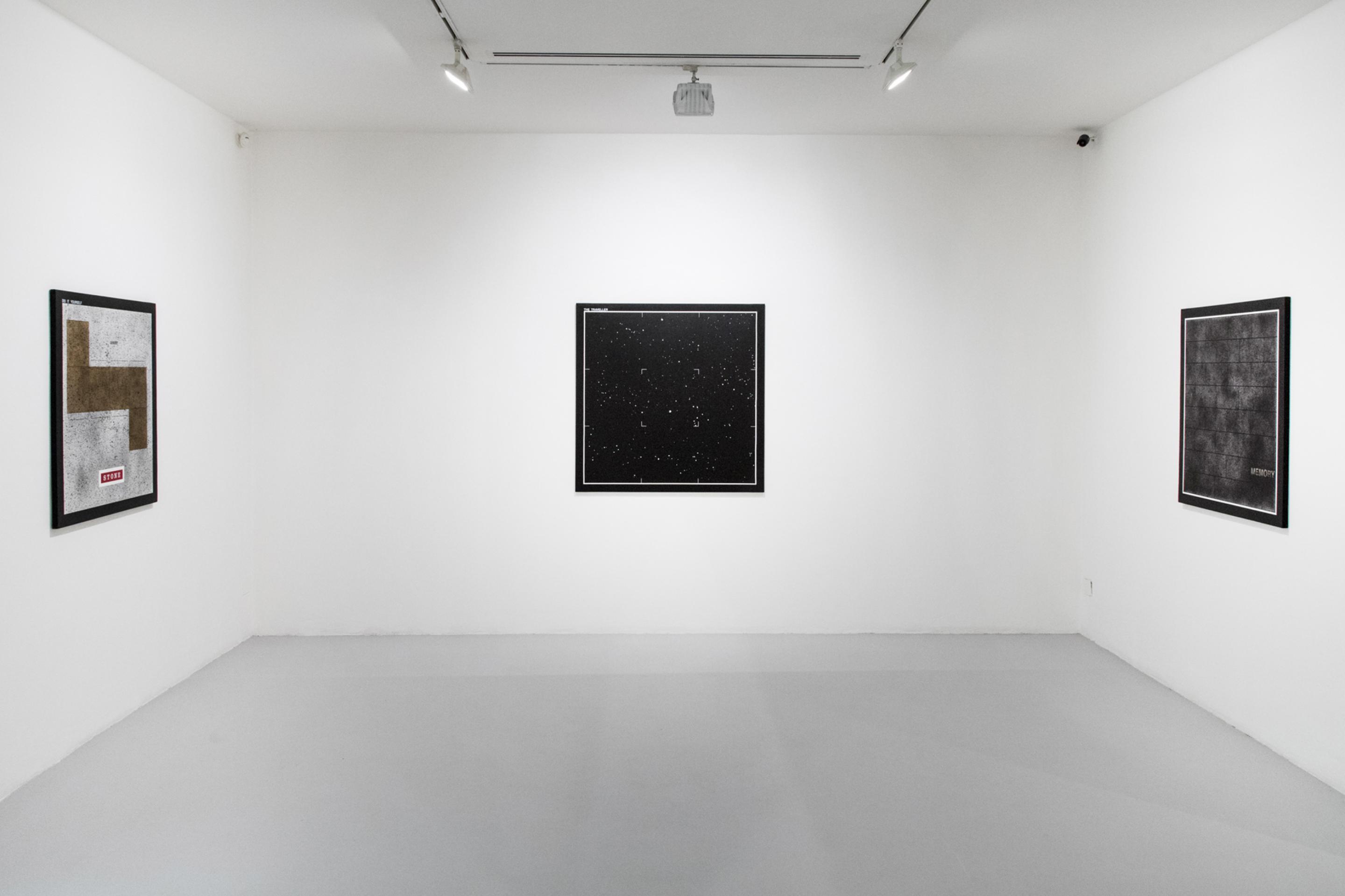 Le opere in mostra sono caratterizzate da una pittura grafica, geometrica, in bianco e nero, intesa a ridurre al minimo gli elementi.