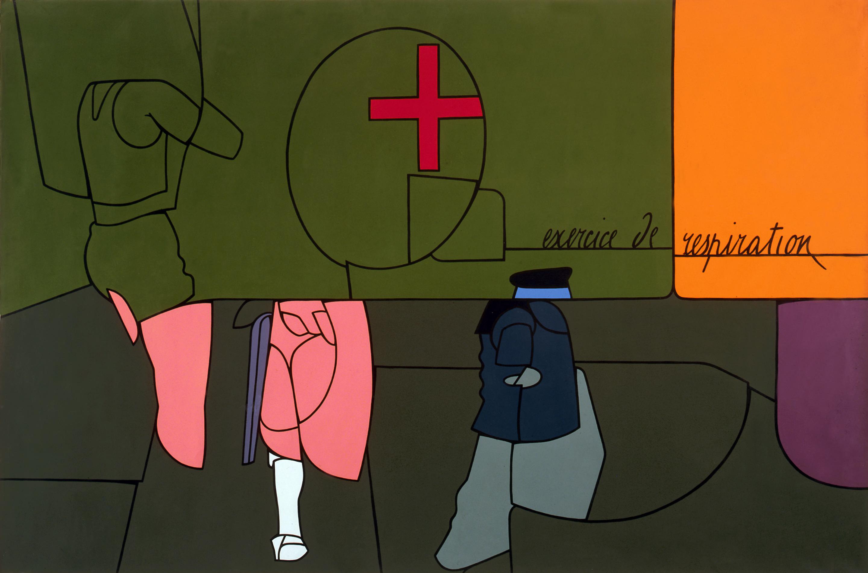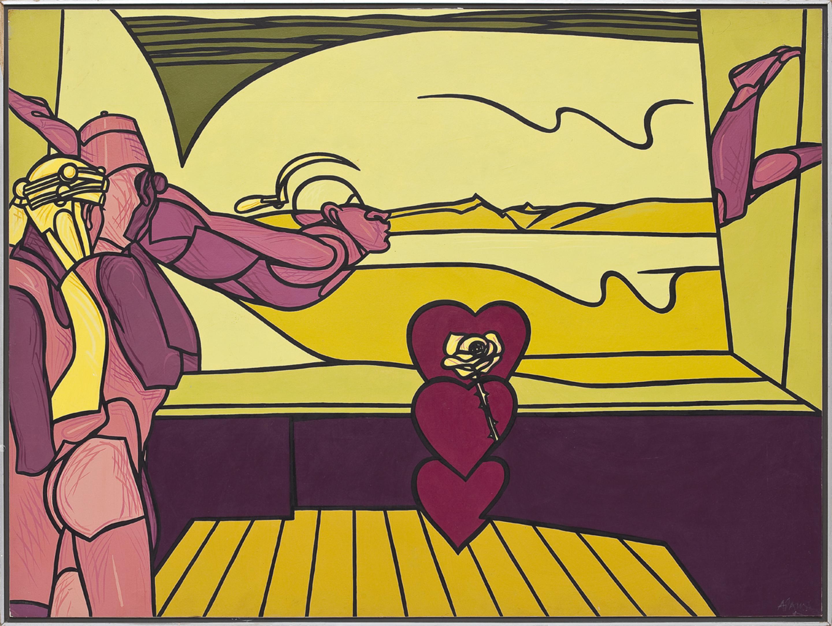 contraddistinti da armoniche campiture, eseguite con colori puri, contornate di nero e del tutto prive di chiaroscuro. Il notevole bagaglio di esperienze, culture e conoscenze acquisite durante i numerosi viaggi, le mostre in giro per il mondo e gli incontri con intellettuali e artisti internazionali gli permettono di far evolvere negli anni la sua arte che assume un aspetto completamente diverso da quello dei primi tempi. I frammenti dei corpi deflagrati, tipici degli anni Sessanta, si ricompongono progressivamente e la sua pittura si popola di figure sempre più classicheggianti e solenni.